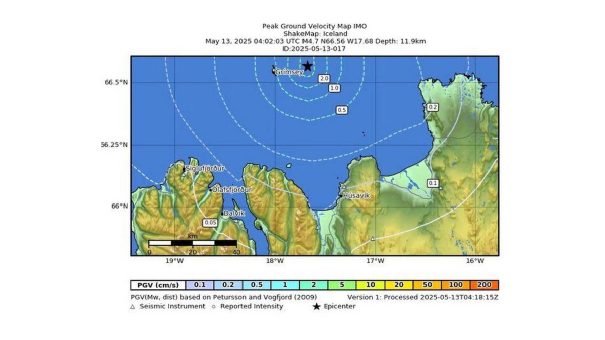 Jarðskjálfti að stærð 4,7 varð rétt austan við Grímsey klukkan 4:02 í nótt. Í kjölfarið fylgdu nokkrir eftirskjálftar, þar af sá stærsti 3,5 að stærð.