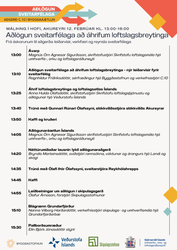Fimmtudaginn 12. febrúar fer fram málþing í Hofi á Akureyri undir yfirskriftinni Aðlögun sveitarfélaga að áhrifum loftslagsbreytinga – frá áskorunum til aðgerða. Málþingið er jafnframt í streymi.
