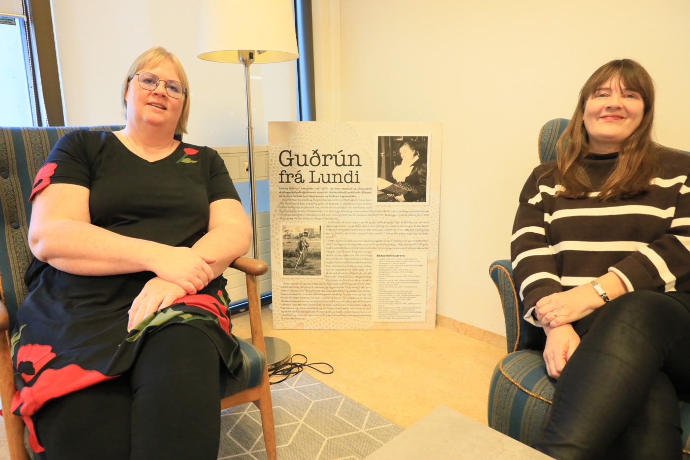 „Árið 2016 fengum við svo báðar sömu hugmyndina, að setja upp sýningu um ævi og störf Guðrúnar. Við ákváðum þá að sameina krafta okkar. Úr varð sýningin „Kona á skjön – ævi og störf Guðrúnar frá Lundi,“ segja Kristín og Marín. Umrædd sýning var fyrst opnuð á Sauðárkróki 3. júní 2017, en þann dag voru 130 liðin frá fæðingu skáldkonunnar. Eftir það hefur sýningin verið sett upp á 12 öðrum stöðum á landinu.