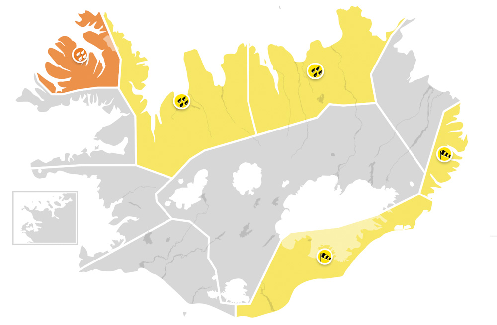 Gul viðvörun á Suðausturlandi tekur gildi í dag kl. níu. Þá verða einnig í gildi gular viðvaranir á Ströndum, Norðurlandi vestra, Vestfjörðum og Norðurlandi eystra.