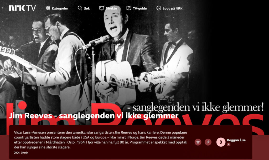 Hér er stuttur dásamlegur norskur Jim Reeves nostalgísku sjónvarpsþáttur, sem er öllum aðgengilegur á streymiveitu NRK TV.