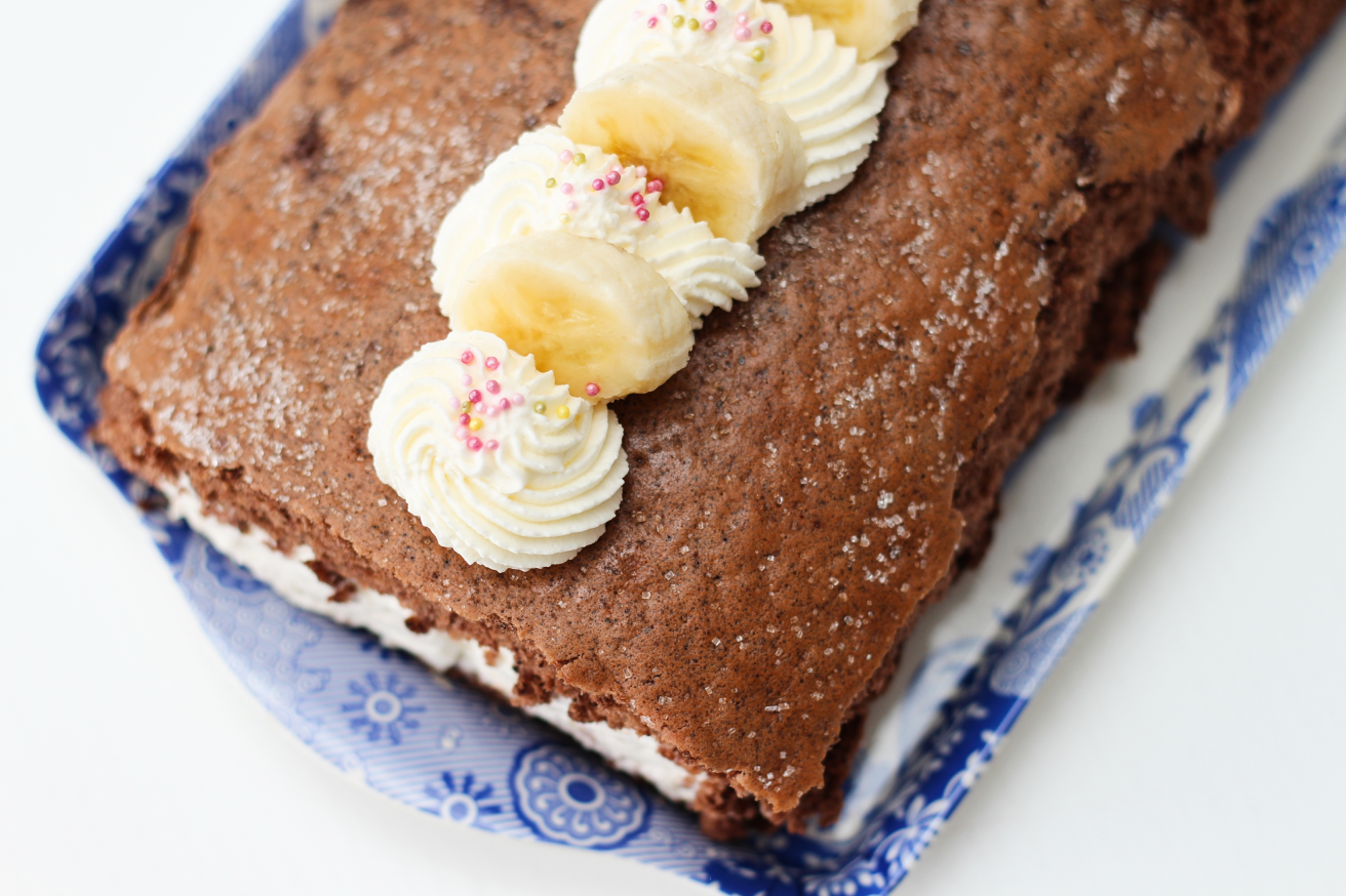 Þeytið rjómann, takið smávegis frá til að skreyta með. Stappið 3 banana og blandið saman við rjómann sem fer í fyllinguna. Smyrjið bananarjómanum á kökuna og rúllið henni upp. Sprautið eða setjið rjóma ofan á rúlluna með skeið og skreytið með banananasneiðum. Kreistið sítrónusafa yfir bananana svo þeir verði ekki brúnir. Stráið súkkulaði ofan á.