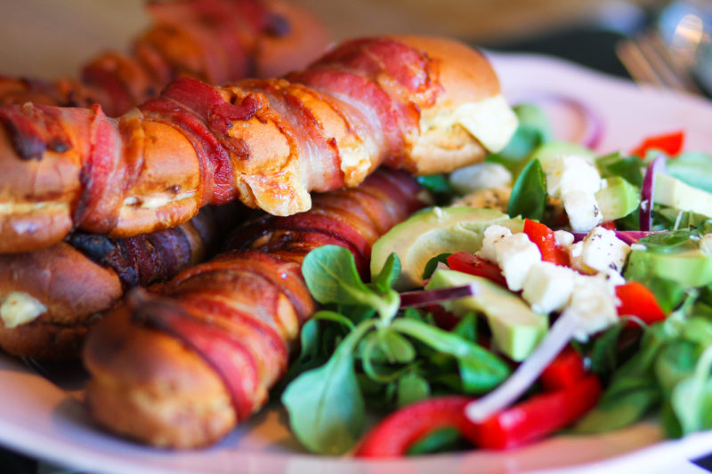 Hitið ofninn i 225°. Smyrjið pylsubrauðið með rækjusmurosti og vefjið beikoni utan um það. Reiknið með 3-4 beikonstrimlum á hvert pylsubrauð.