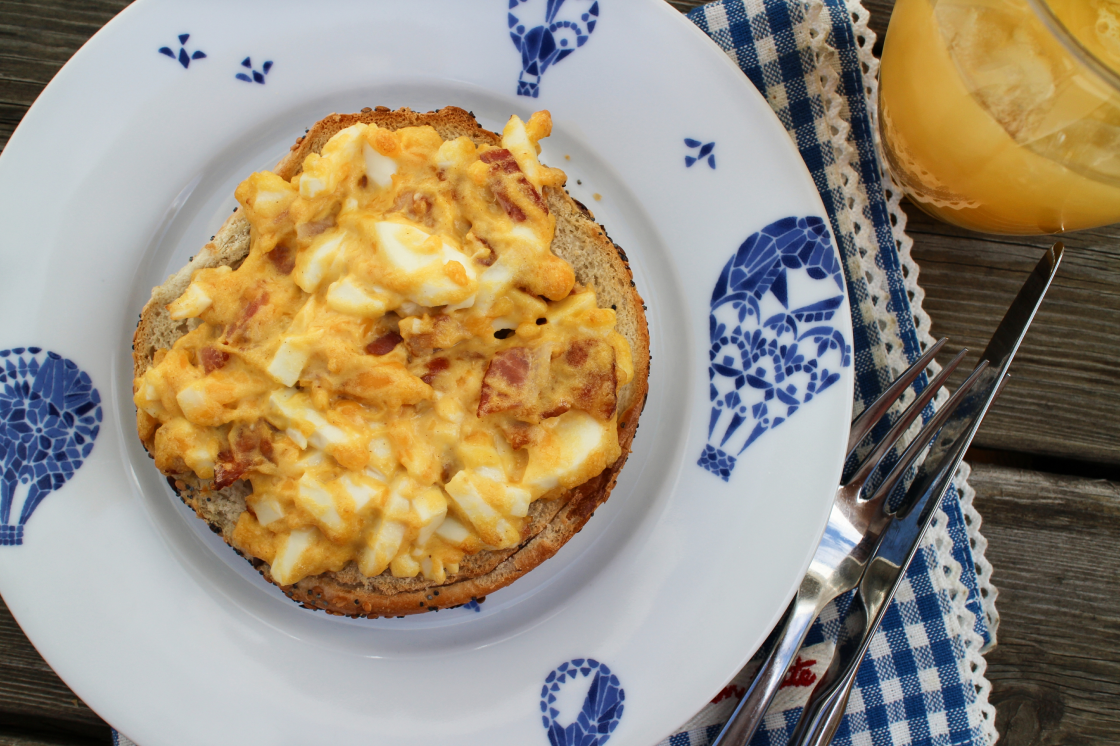 Beyglur með beikon-, eggja- og cheddarhræru (fyllingin dugar á 6 beygluhelminga)