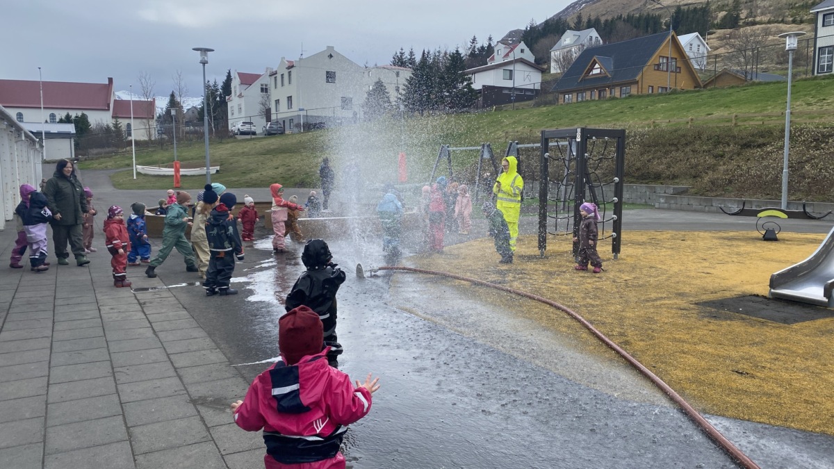 Að sjálfsögðu var svo öllum börnum á báðum leikskólunum boðið að sulla í vatni í einum af vatnsbogum slökkviliðsins.