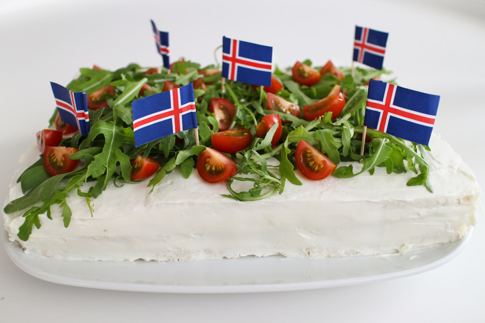 Smyrjið philadelphia ostinum meðfram hliðunum og yfir brauðtertuna. Skreytið með ruccola og kirsuberjatómötum.