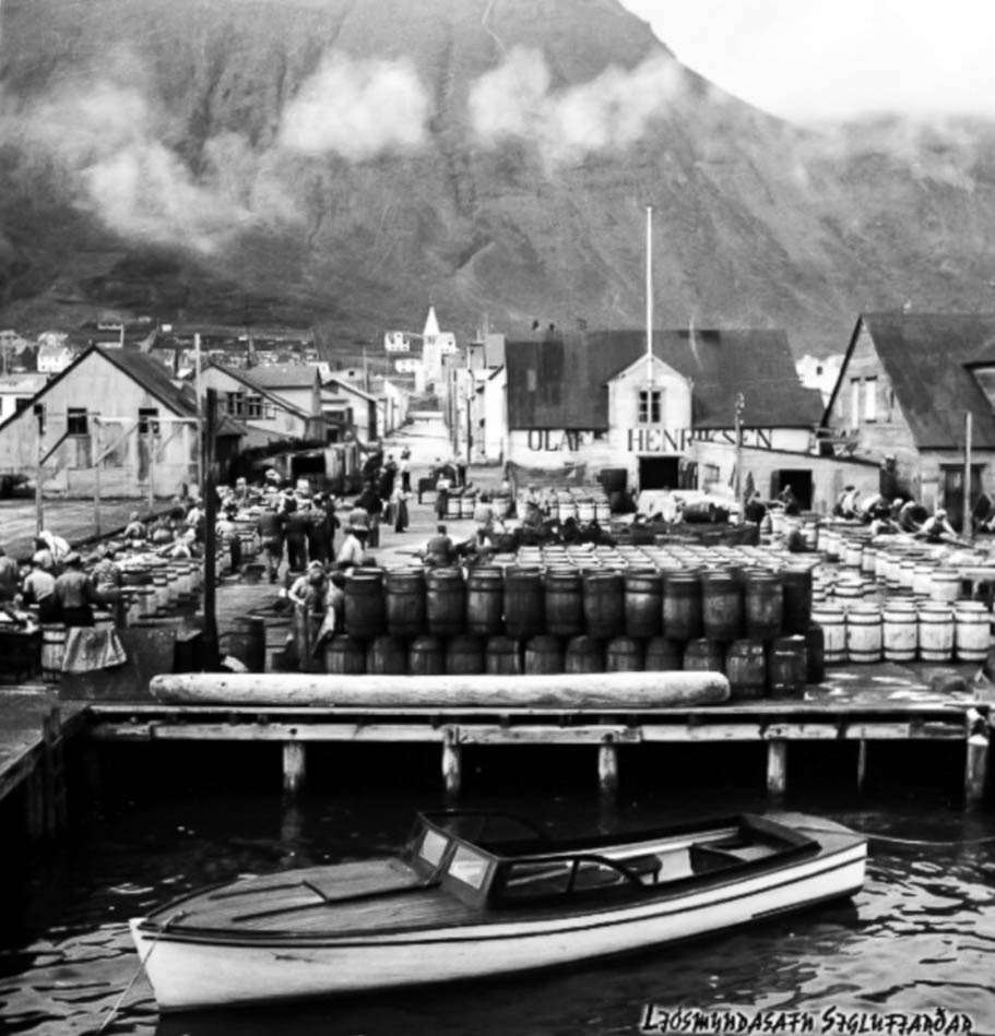 Hún minntist þess vel að um miðnætti þegar hún kófsveitt í sumarhitanum gaf sér tíma til að líta upp úr tunnu og þurrkaði af sér svita, tók hún eftir því að það var skollið á Siglfirskt galdralogn og hún sá einnig mýflugu ský svífa yfir pollunum á Leirutanganum sunnar í firðinum.