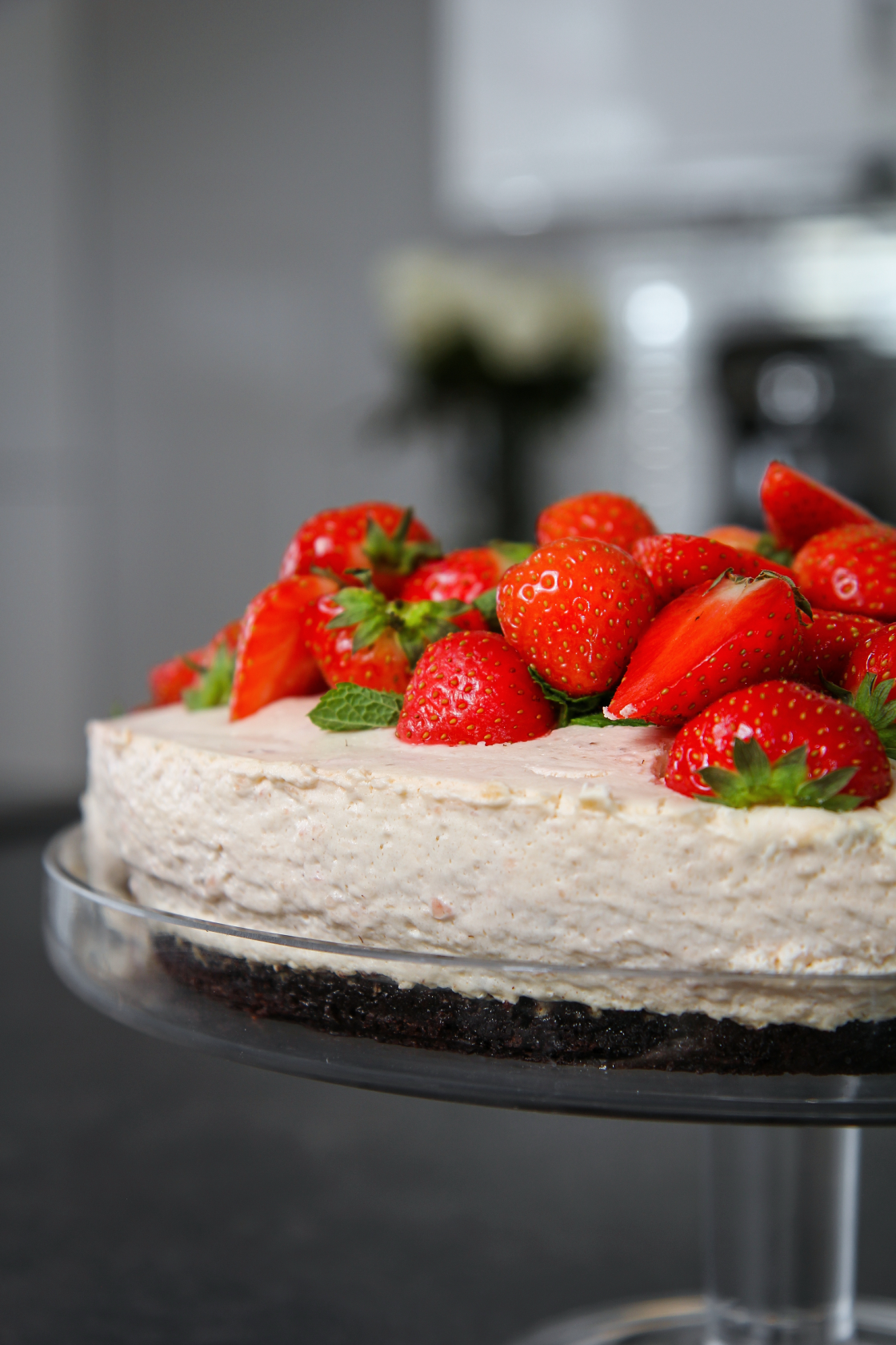 Setjið jarðaber yfir kökuna áður en hún er borin fram.