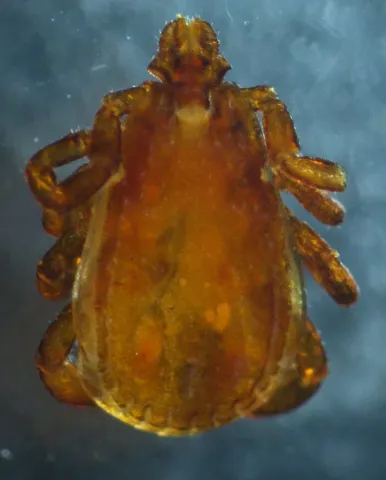 | Mynd af Brúna hundamítlinum. Myndin er fengin af vefsíðu Keldna og tekin af Guðnýju Rut Pálsdóttur, sníkjudýrafræðingi. |