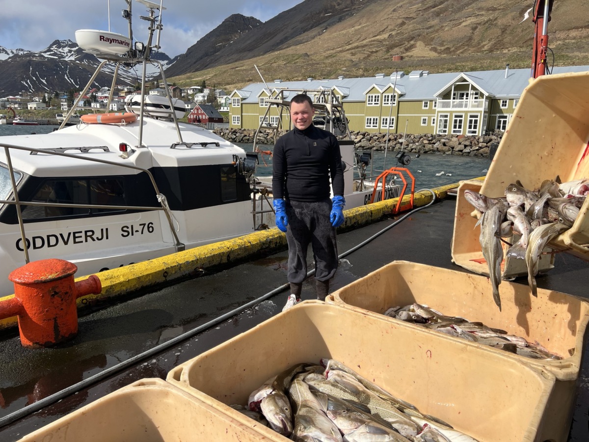 Bæjarstjóri / Hafnarstjóri Fjallabyggðar Sigríður Ingvarsdóttir hitti á rölti sínu um hafnarbryggjuna í morgunsárið hinn 18 ára nýstúdent, Jón Grétar Guðjónsson sem einnig hefur nýlokið skipstjórnarréttindum. Jón Grétar var á fullu að landa úr Oddverja SI en Jón Grétar er á strandveiðum þessa dagana.