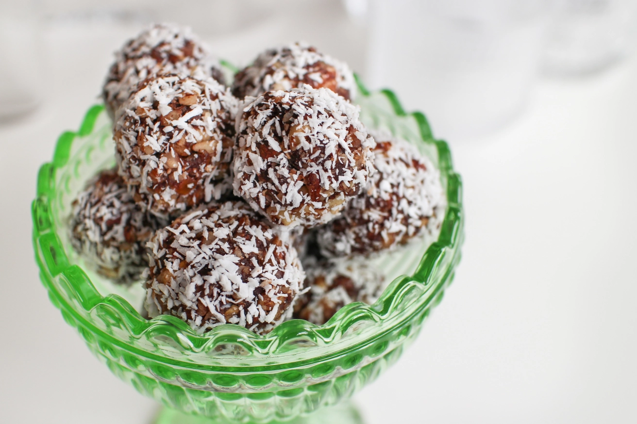 Setjið allt hráefnið fyrir utan kókosmjölið í matvinnsluvél eða vinnið saman með töfrasprota. Rúllið litlar kúlur úr blöndunni og veltið upp úr kókosmjöli.