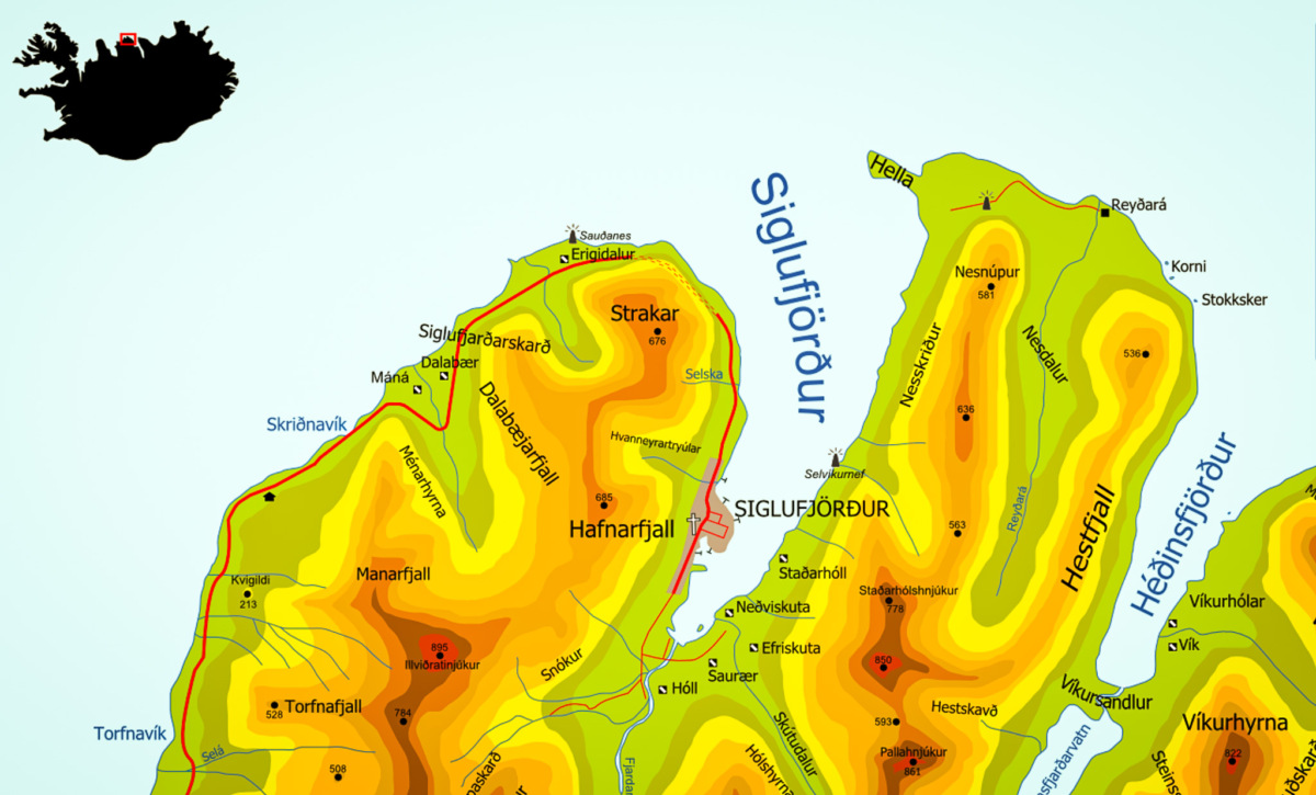 Siglufjörður er vissulega ekkert sérstaklega stór fjörður, mun minni, styttri og mjórri en Ólafsfjörður, en hér á Sigló eru samt til nokkrir misstórir alvöru dalir. Auðvelt er að fara inn í og sjá inn í botn af þeim flestum, eins og t.d. Hólsdal, Skútu- og Skarðsdal. Eins og sjá má á forsíðumyndinni er Kálfsdalur ekki einu sinni nefndur á nafn á kortinu, en hann er þarna ofan við gamla Selvíkurvitann. Hálf ósýnilegur og dularfullur dalur og enn meira ósýnilegur er Nesdalur, en þangað er frekar auðvelt að komast ef maður gengur yfir Kálfsskarð og þaðan niður í Nesdal. (Reyðarárdal)