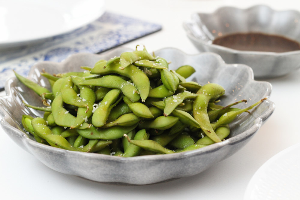 Hitið vatn að suðu og setjið edamame baunirnar í pottinn. Látið sjóða í 4 mínútur (ekki láta þær sjóða of lengi því þær eiga ekki að verða mjúkar). Takið baunirnar úr pottinum og setjið í skál með klakavatni í, til að koma í veg fyrir að þær haldi áfram að eldast. Þurrkið baunirnar og blandið þeim saman við saltið.