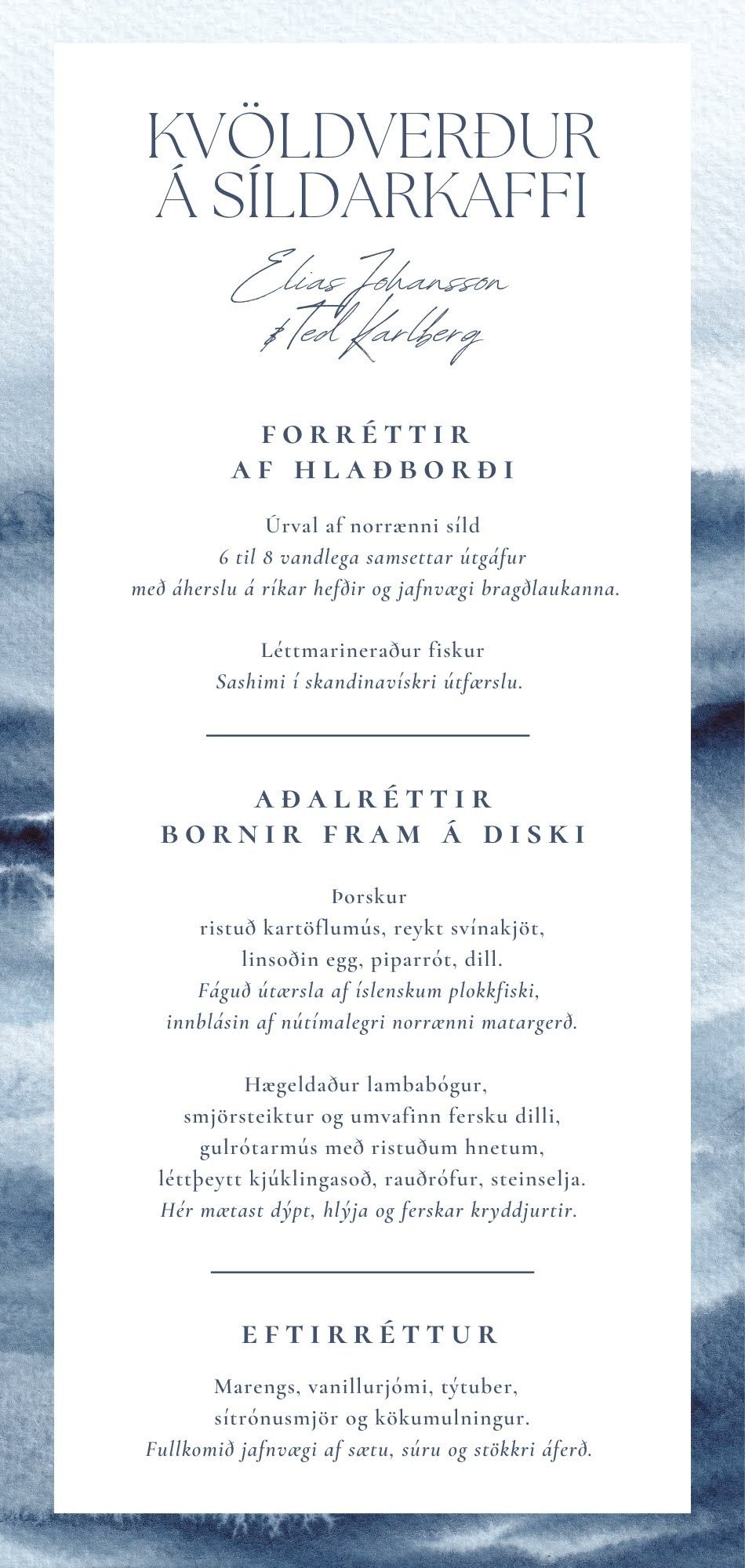 Matseðill kvöldsins á Síldarkaffi þriðjudaginn 31. mars endurspeglar skandinavíska nálgun Eliasar Johansson og Teds Karlberg.