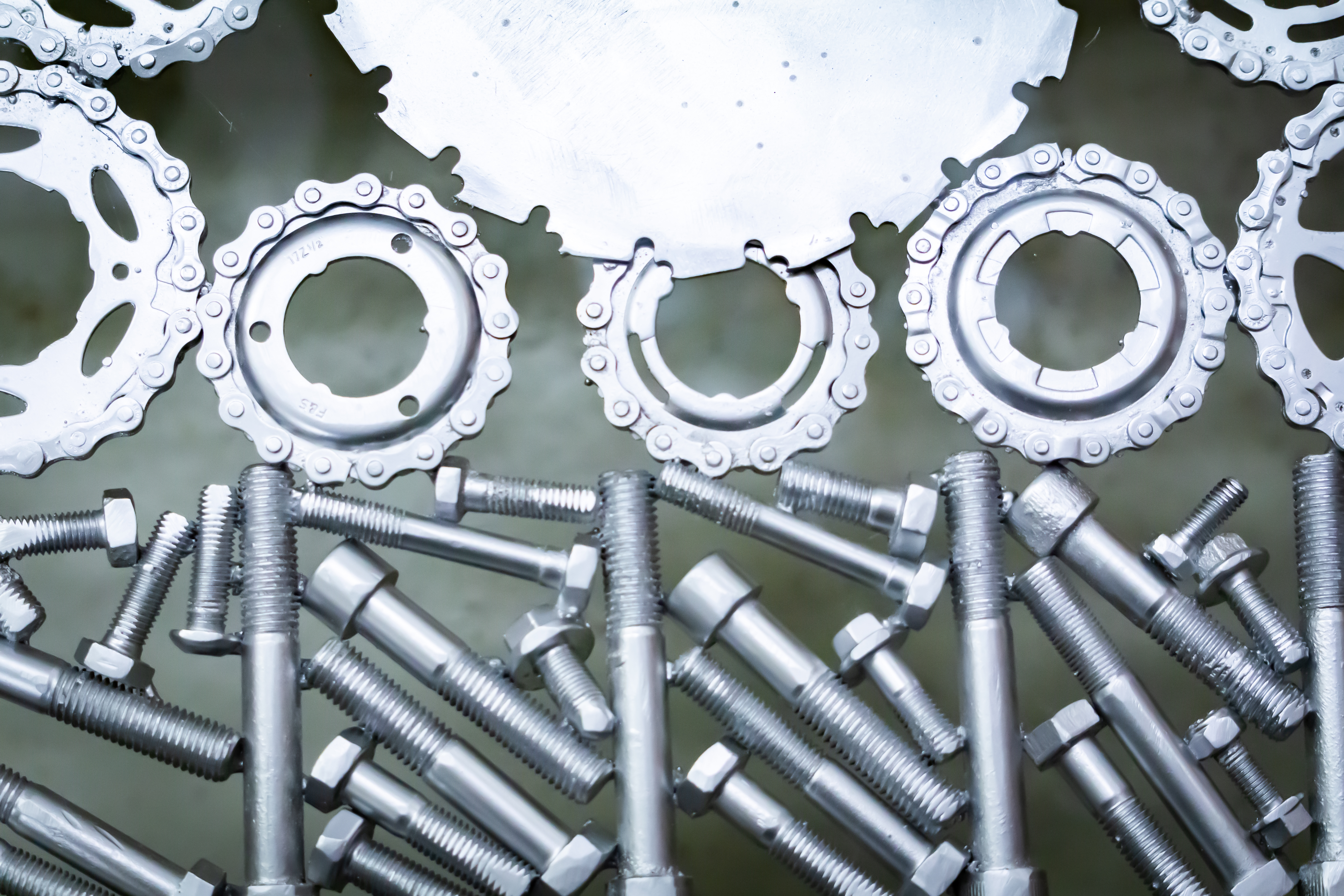 Svört reiðhjólakeðju ljósakróna. Það var önnur þarna sem var silfurlituð.