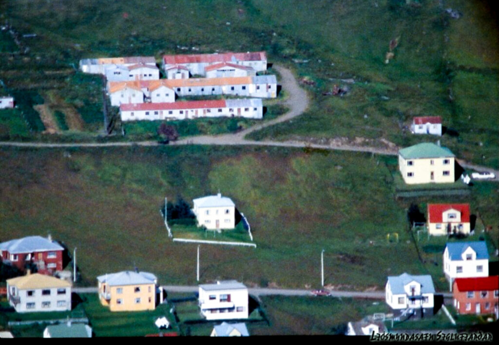 Hún sýnir okkur einmitt næringarríkan reyk frá bræðsluverksmiðjum bæjarins og einnig þessi tré og langa grænmálaða flotta girðingu, sem kemur líklega árlega illa undan snjó. Henni var samt lengi vel haldið við og ætlunin er að verja blómabeðin við húsvegginn og þennan litla trjálund fyrir átroðningi frá ókunnugu fólki og… sauðfé.
