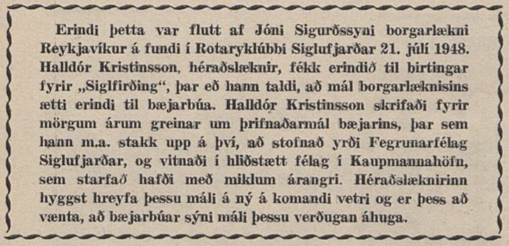 Út frá fyrri tilvísun í greinina varðandi jólaskreytingar o.fl. í verslunum frá 1950, hefur Halldóri Héraðslækni greinilega tekist ætlunarverk sitt og Fegrunarfélag Siglufjarðar virðist næstu árin hafa hin ýmsu afskipti af fagurfræðilegum málum á Siglufirði og eflaust hafa menn sótt sér innblástur frá góðum árangri af þessu mikla hreinsunar og fegrunarátaki í Reykjavík sumarið 1948.