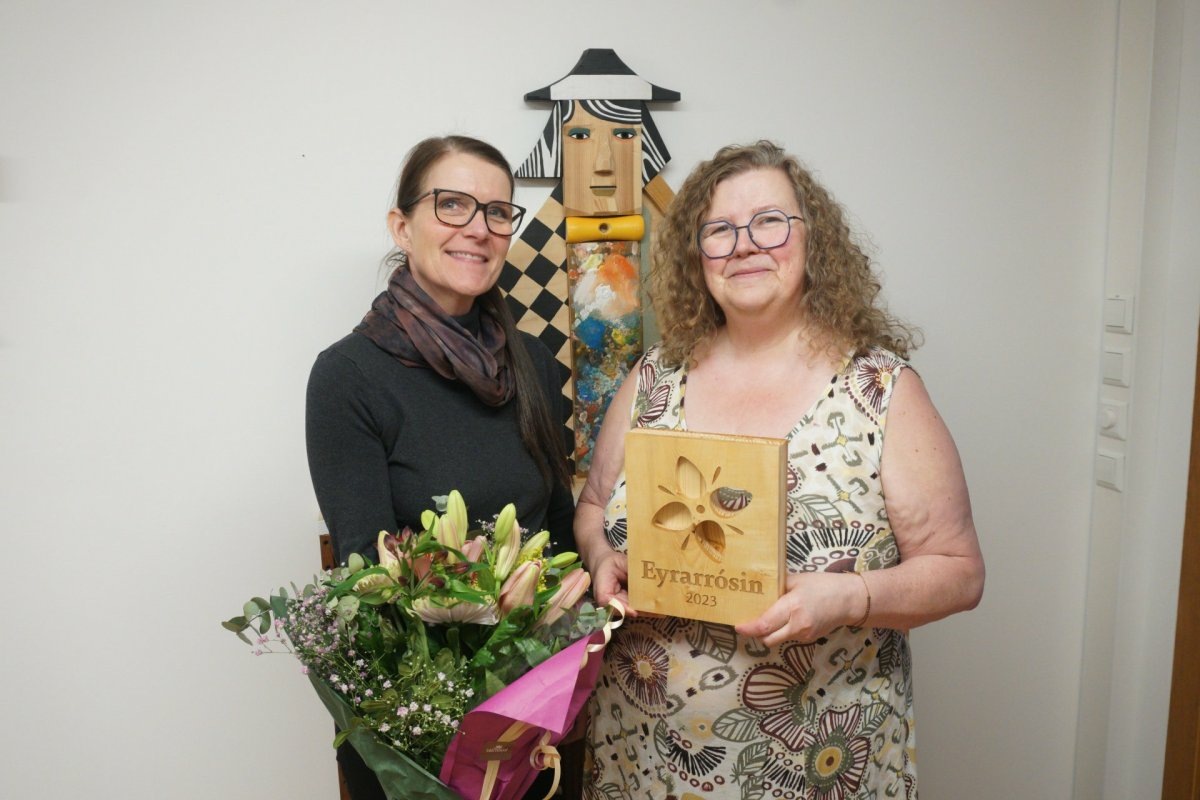 Á myndinni er Eyrarrósarhafinn Aðalheiður S. Eysteinsdóttir ásamt markaðs- og menningarfulltrúa Lindu Leu Bogadóttur. Inn á myndina laumaði sér skemmtileg lágmynd eftir Aðalheiði sem verður meðal annarra verka á sýningu Aðalheiðar í Hofi á Akureyri frá 27. maí út ágúst.