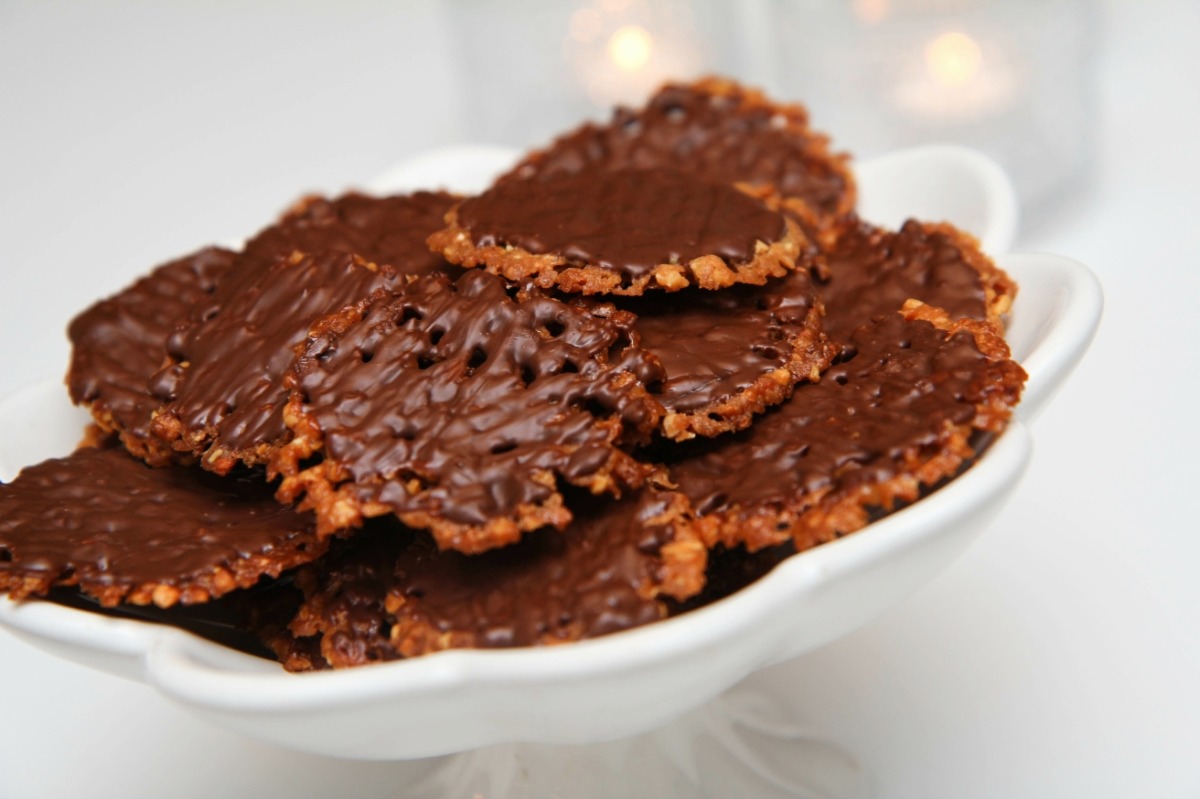 Bakið kökurnar við 180°C í 8 – 10 mínútur. Leyfið þeim að kólna í ca. 5 mínútur áður en þær eru færðar á grind. Leyfið þeim að kólna alveg og smyrjið þær síðan með bráðnu súkkulaði.
