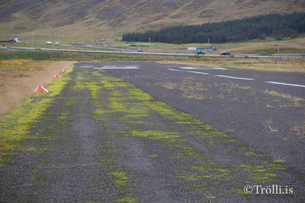 Fréttaritari fór með myndavélina og skoðaði brautina. Meðfylgjandi eru myndir af ástandinu ásamt mynd frá 13. júlí 2018 þegar verið var að malbika.