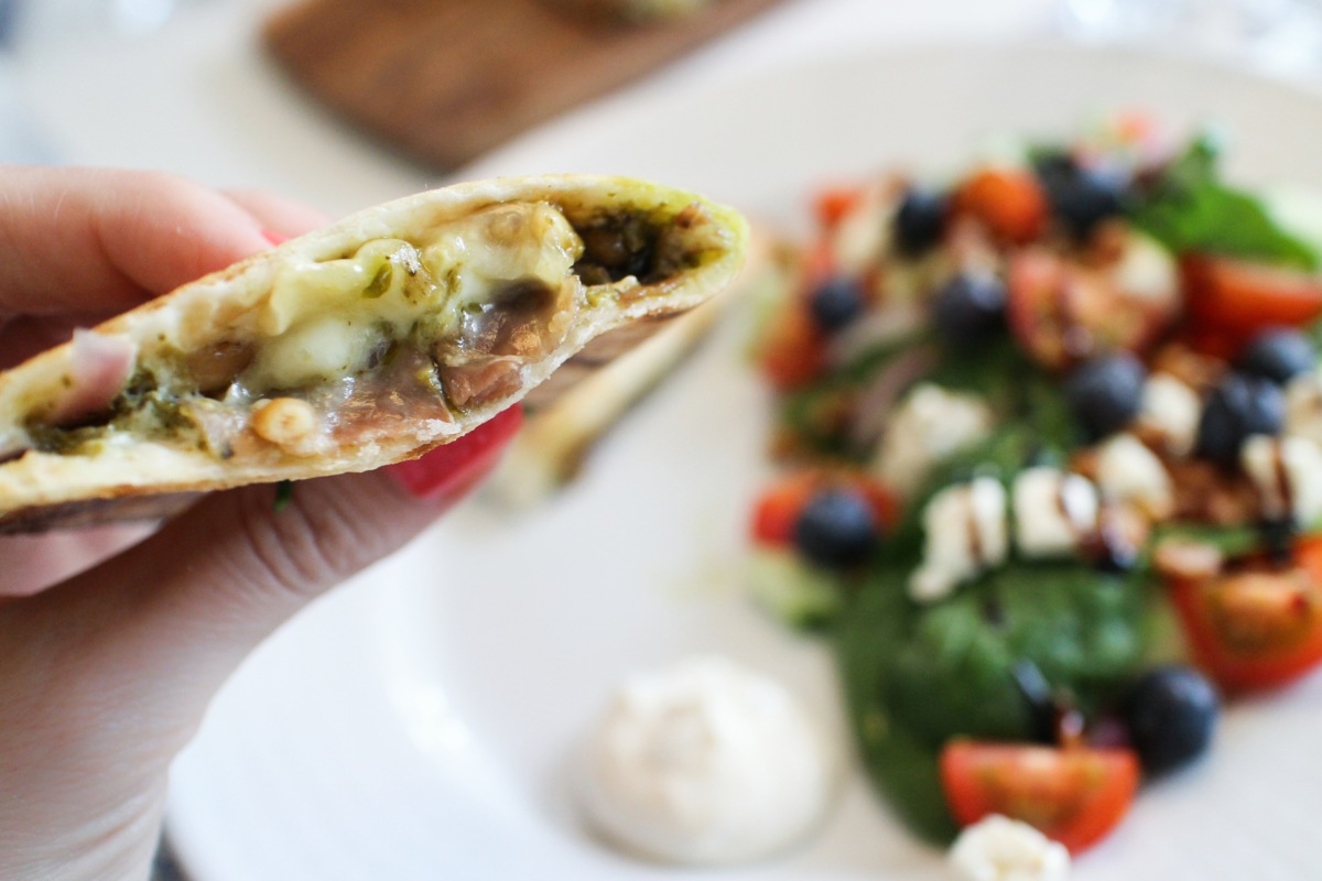 Smyrjið tortillupönukökurnar með rjómaosti. Smyrjið síðan pestó yfir hálfa tortilluna og raðið síðan hráskinku, papriku og rauðlauki yfir. Sáldrið smá hunangi yfir. Setjið ristaðar furuhnetur yfir og nokkrar ostsneiðar. Klemmið vel saman og penslið með hvítlauksolíu. Grillið á báðum hliðum þar til osturinn er bráðnaður.