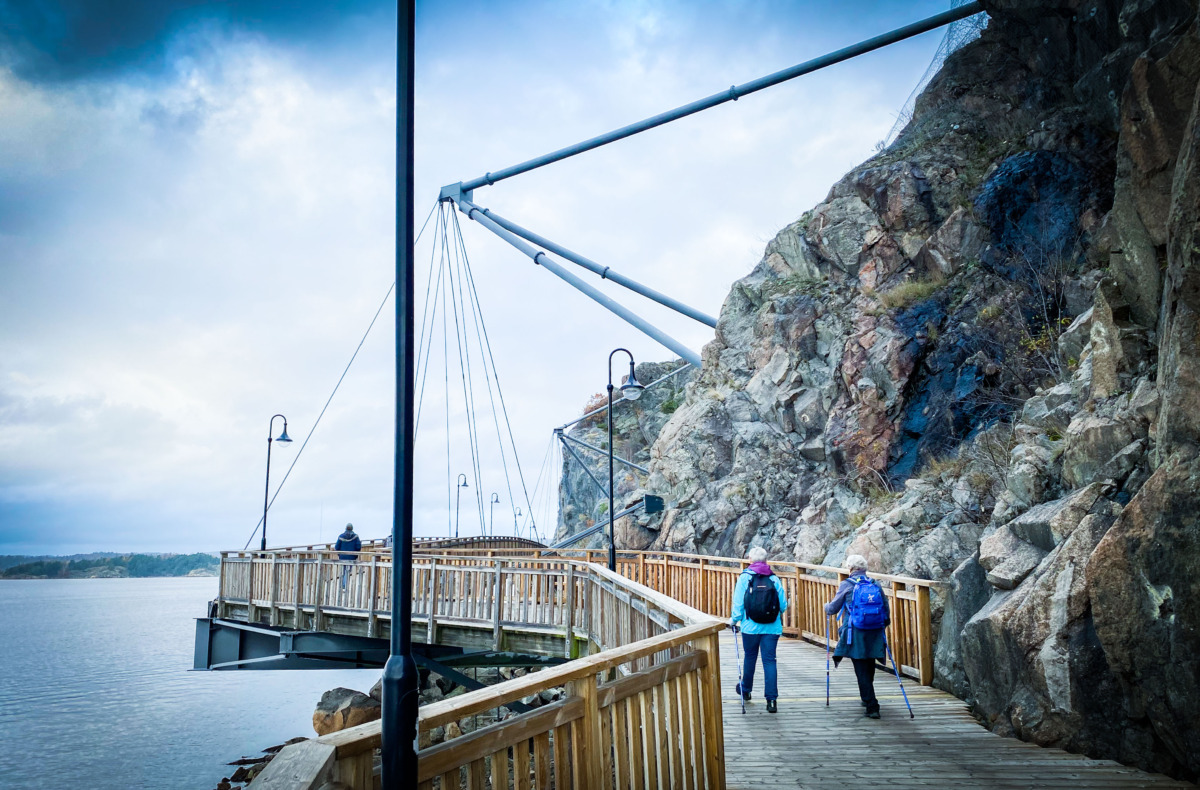 Eins og sjá má á myndunum hér undir var það bæði erfitt og dýrt að byggja þessa gönguleið sem af mörgum er talin sú allrar fallegasta í Svíþjóð. Fyrir miðju er hengibrú yfir vík með grjótskriðum og þaðan er fallegt útsýni út Uddevallafjörðinn og í fjarlægð sér maður fallega risastóra hengibrú yfir sjálfan fjörðinn.