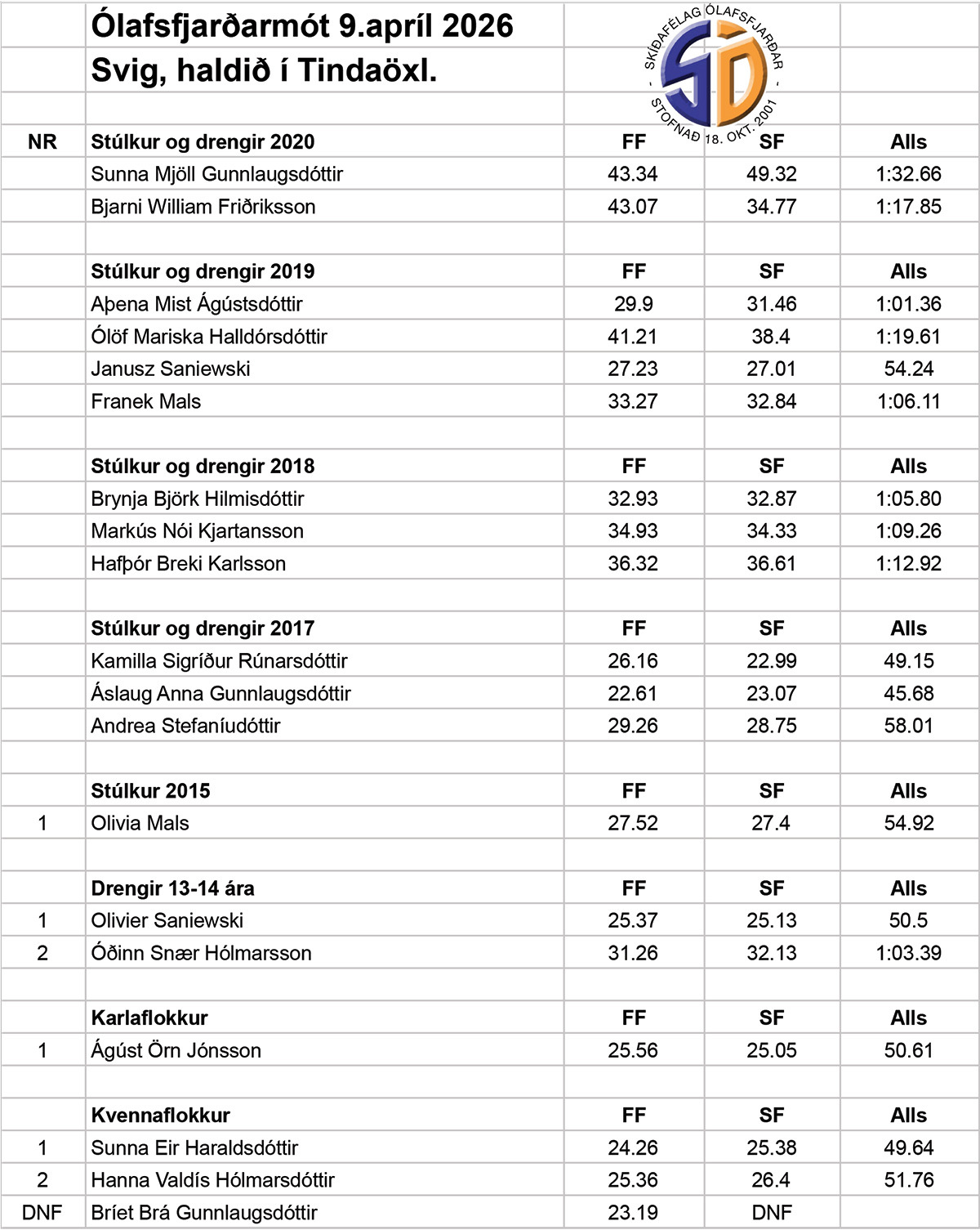 Að skíðagöngu lokinni var strax haldið áfram með svigkeppni um klukkan 18:00. „Veður lék við okkur í dag, færið reyndar blautt og þungt enda um 10 stiga hiti, logn en sólin lét sig hverfa,“ segir í tilkynningu Skíðafélags Ólafsfjarðar.
