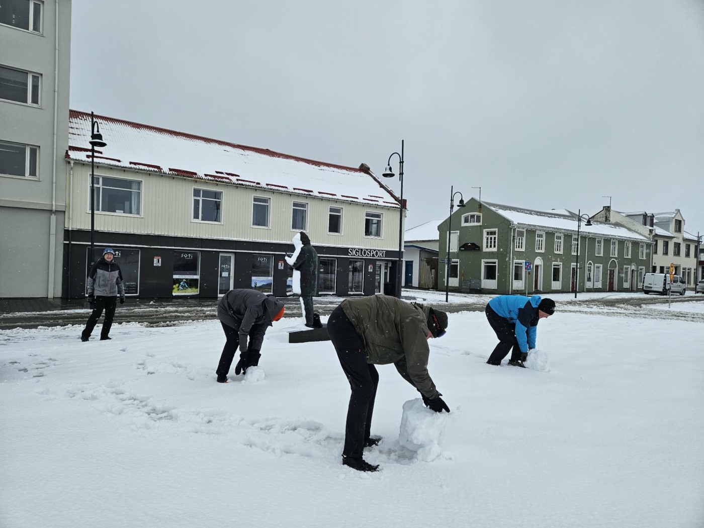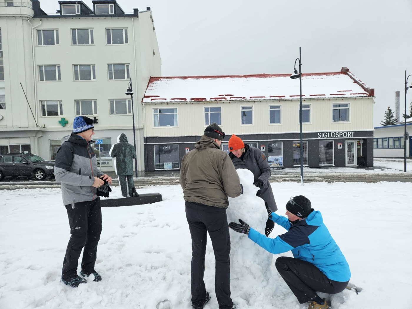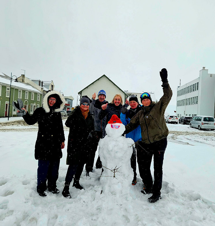 Það var líf og fjör á Siglufirði þegar gönguhópurinn Hátindur 60+ lét til sín taka í síðustu göngu og setti upp snjókarl á Torginu. Göngufólk tók sprellið föstum tökum, hló dátt og naut samverunnar, enda ekki á hverjum degi sem gönguferð breytist í leik og gleði af þessu tagi.