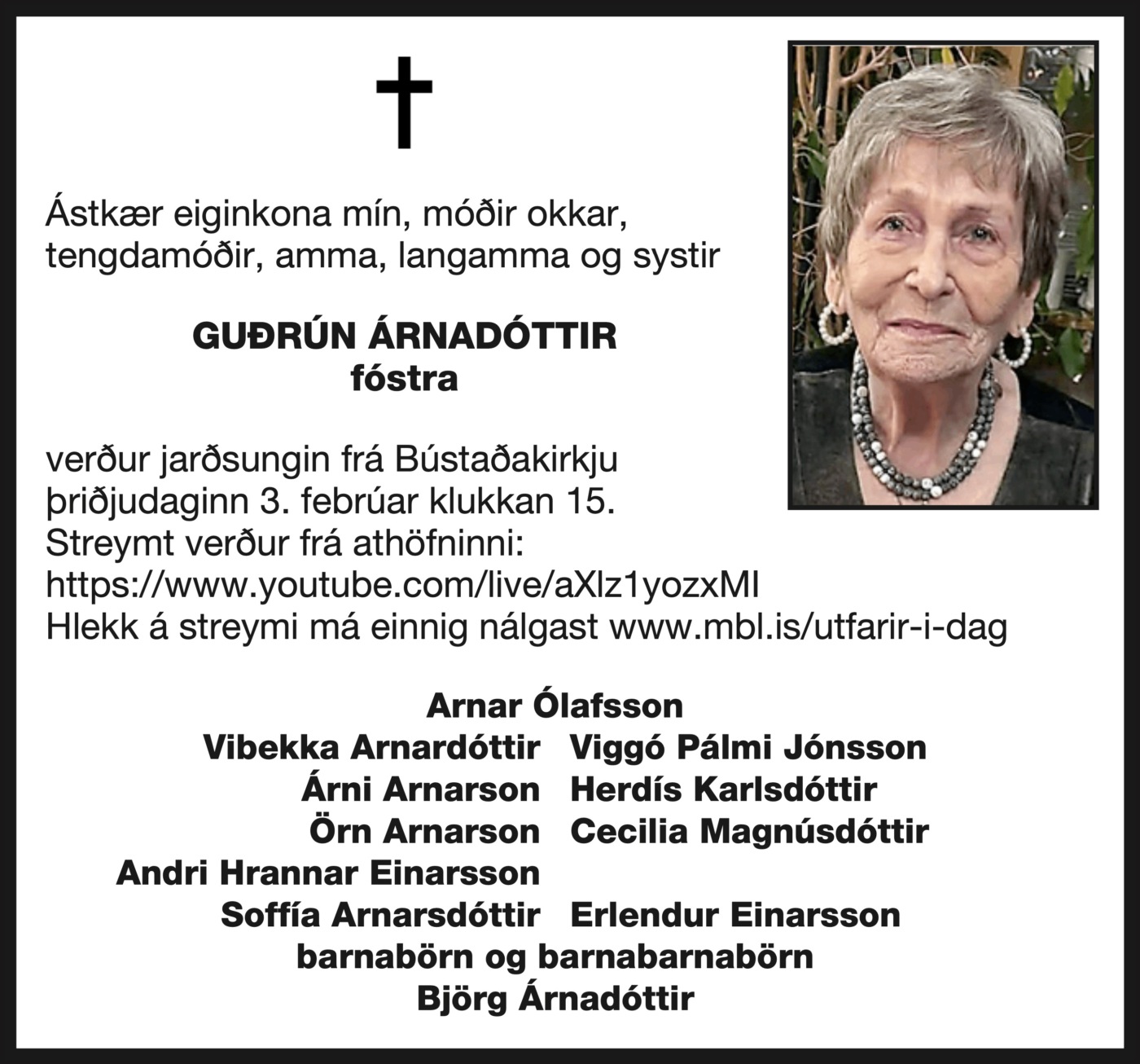 Guðrún verður jarðsungin frá Bústaðakirkju þriðjudaginn 3. febrúar kl. 15:00 og verður streymt frá athöfninni.
