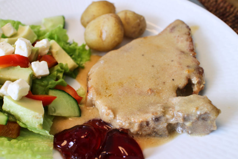 Takið kjötið af pönnunni og sigtið sósusoðið. Setjið soðið aftur á pönnuna (laukurinn og gulrótin eiga ekki að vera með), hrærið rjóma og sýrðum rjóma saman við og smakkið til með sojasósu, salti og pipar. Setjið smá sykur í sósuna og leggið kóteletturnar í og látið sjóða saman í nokkrar mínútur. Berið fram með kartöflum og rifsberjahlaupi.