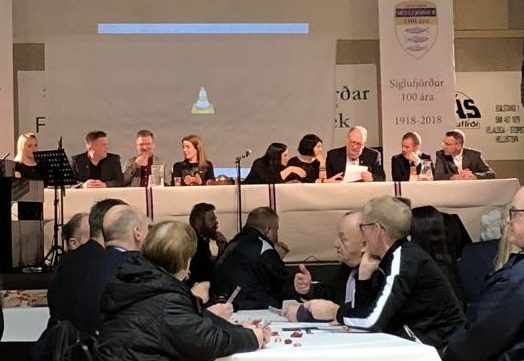 Mikið fjölmenni kom saman í íþróttahúsinu á Siglufirði þar sem hátíðardagskrá var sunnudaginn 20. maí vegna 100 ára afmælis Siglufjarðarkaupstaðar.