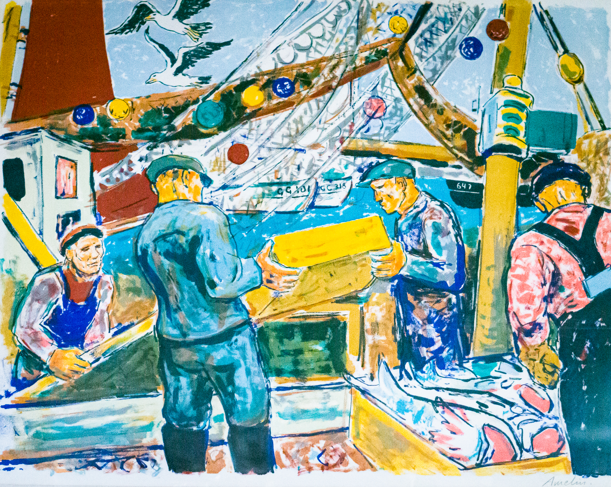 Uppi á sviðinu í litla Byggðarsafninu hangir þetta fallega listaverk af sjómönnum að þvo humartínur eins og altaristafla.