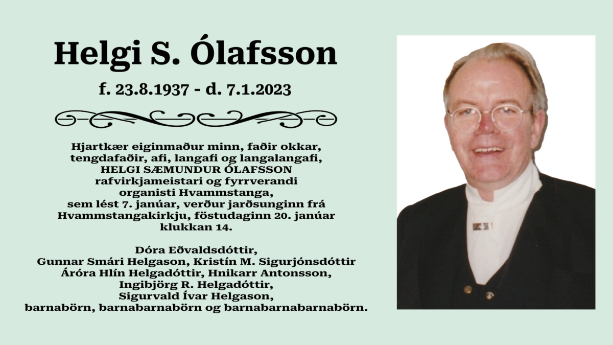 Helgi Sæmundur Ólafsson fæddist 23. ágúst 1937 á Siglufirði. Hann lést á Heilbrigðisstofnun Vesturlands á Hvammstanga 7. janúar 2023.