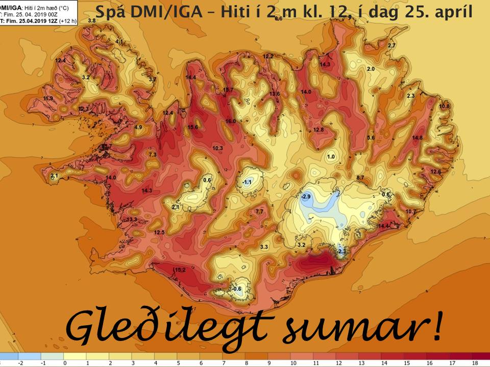 Segir þar að sennilega verði hvað hlýjast í dag á Vesturlandi, mögulega Borgarfirði eða til landsins vestantil á Norðurlandi.