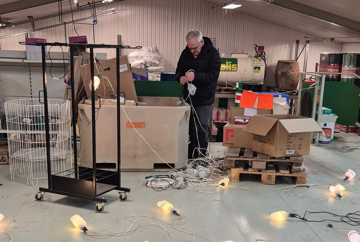 Skúli Jónsson á Eyri við yfirferð á ljósaseríunni í ártalinu áður en jólaljósin fara upp.