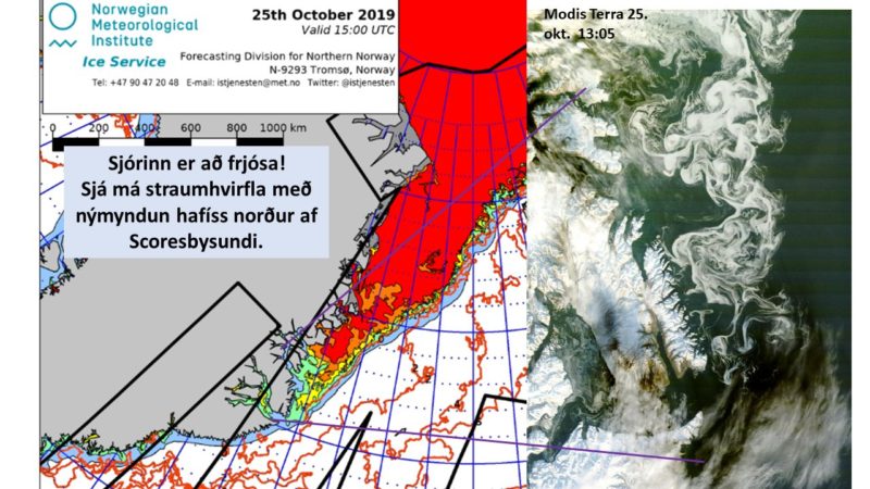 Á hinni geysigóðu loftmynd í gær mátti sjá fleira en snævi þakið landið rúmlega til hálfs. Nýmyndanir hafíss norður af Skoresbysundi voru tilkomumiklar í kalda pólsjónum þar. Í gær var þarna hægviðri, alls ekki mikið frost, um leið og lægir og sjórinn kyrrast getur þarna frosið og lagt. Straumhvirflar nýíssins eru fyrir augað. Síðar nær hann að verða samfrosta.