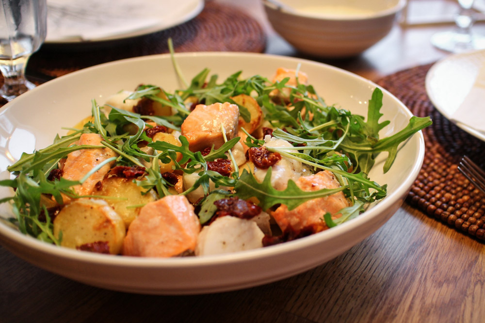 Skerið laxinn (og þorskinn sé hann notaður) í bita sem eru um 2×2 cm að stærð. Þegar kartöflurnar hafa verið í ofninum í 20 mínútur er laxinum bætt á ofnplötuna, nokkrar matskeiðar af olíunni frá sólþurrkuðu tómötunum sáldrað yfir ásamt grófu salti og sett aftur í ofninn í 10 mínútur til viðbótar. Þegar laxinn og kartöflurnar koma úr ofninum er hökkuðum sólþurrkuðum tómötum stráð yfir ásamt klettasalati. Setjið réttinn á fallegt fat og berið fram með fetaostasósu.