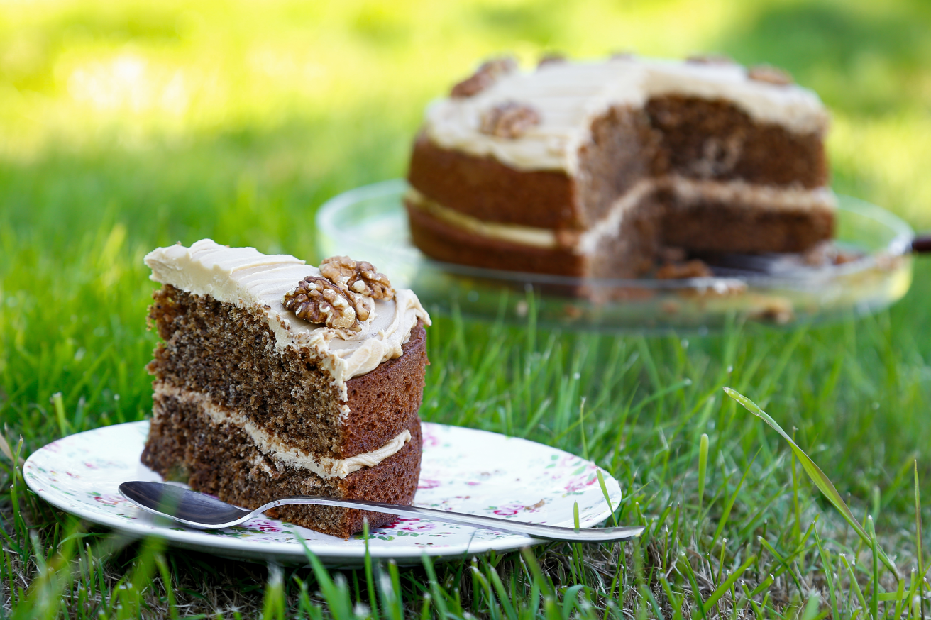 Hitið ofninn í 180°. Klæðið botninn á tveimur 20 cm kökuformum með smjörpappír og smyrjið hliðarnar. Setjið valhnetur og sykur í matvinnsluvél og látið vélina ganga þar til hneturnar og sykurinn eru orðin að fíngerðum hnetusykri. Bætið smjöri, hveiti, espresso dufti, lyftidufti, matarsóda og eggjum í matvinnsluvélina og vinnið saman í slétt deig. Látið að lokum mjólk renna niður troðarann á meðan matvinnsluvélin gengur. Skiptið deiginu í formin og bakið í 25 mínútur. Látið kökubotnana kólna alveg áður en glassúrinn er settur á.