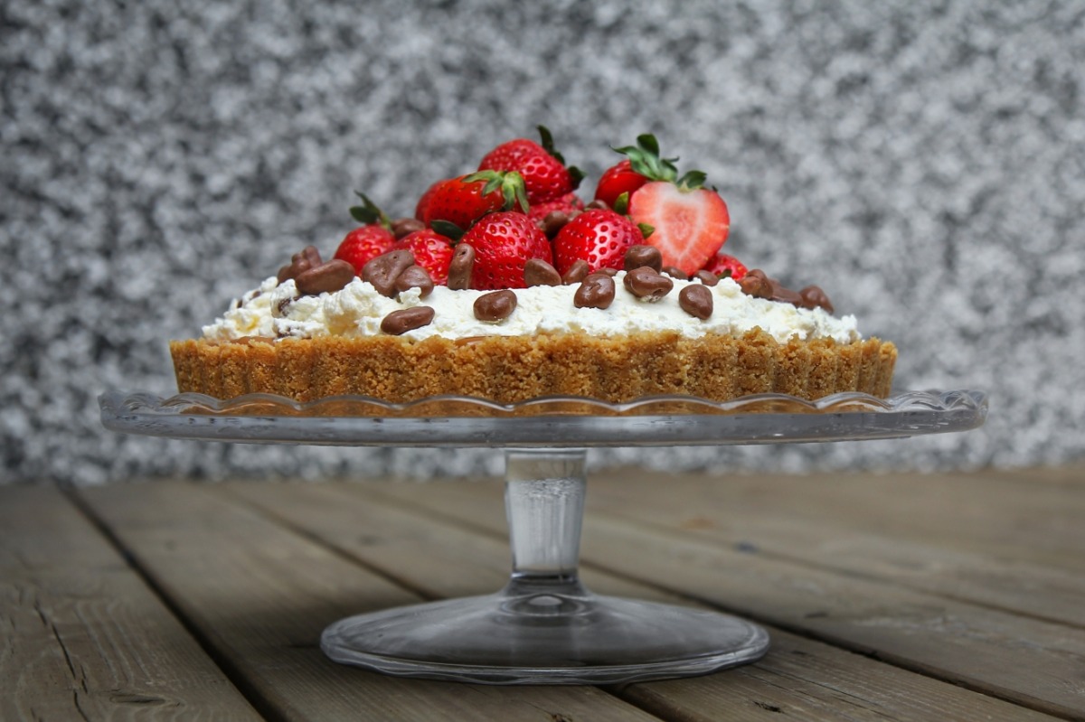 Látið kökuna standa í ísskáp þar til hún er borin fram.