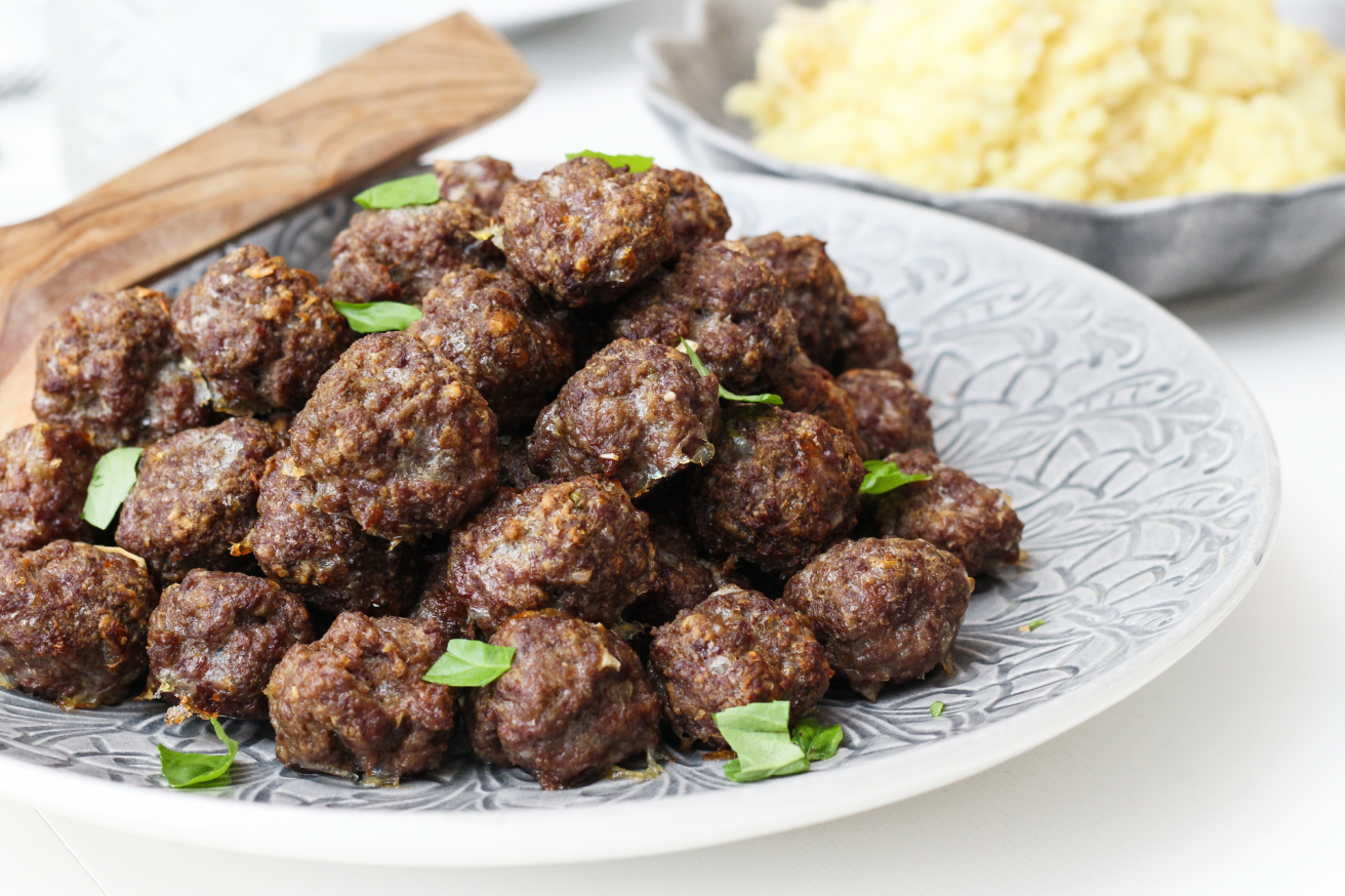 Hrærið allt saman og mótið kjötbollur. Bakið við 180° í 15 mínútur.