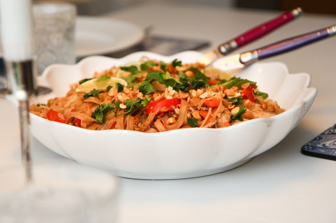 Hitið olíu á pönnu yfir miðlungsháum hita og steikið kjúklinginn þar til hann er fulleldaður (það tekur um 4-6 mínútur). Takið kjúklinginn af pönnunni. Setjið papriku og gulrætur á pönnuna og steikið í 1-2 mínútur, bætið þá hvítlauk, vorlauk og baunaspírum á pönnuna og steikið í 1-2 mínútur til viðbótar. Ýtið grænmetinu til hliðar á pönnunni og brjótið eggin í miðjuna. Hrærið í eggjunum þar til þau eru fullelduð. Bætið kjúklingi, núðlum og sósu á pönnuna og blandið öllu vel saman. Steikið saman í 1-2 mínútur. Stráið fersku kóriander og salthnetum yfir og berið fram.