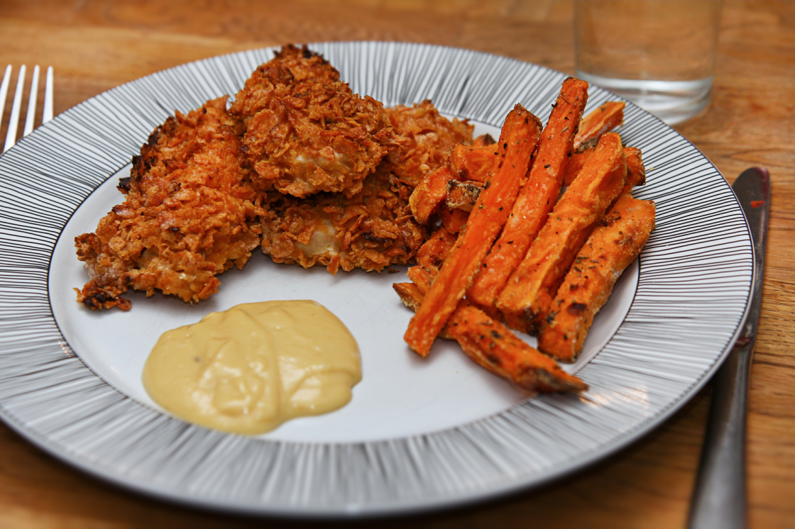 Kjúklingabitar og sætar kartöflufranskar með hunangssinnepssósu