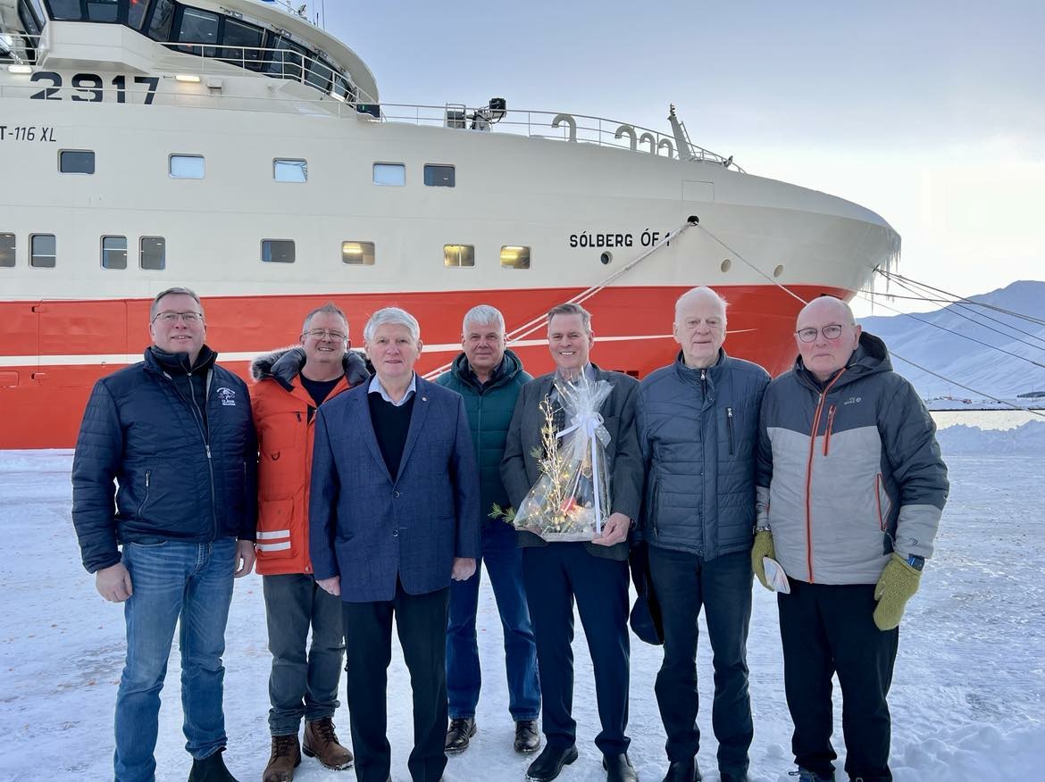 Var Vilhjálmi þakkað langt og farsælt samstarf og á forsíðumynd er hann með helstu samstarfsmönnum símum í landi og á mynd í frétt er hann ásamt Svavari Berg Magnússyni fyrrverandi framkvæmdastjóra MG hf. og síðar stjórnarmanni í Rammanum.