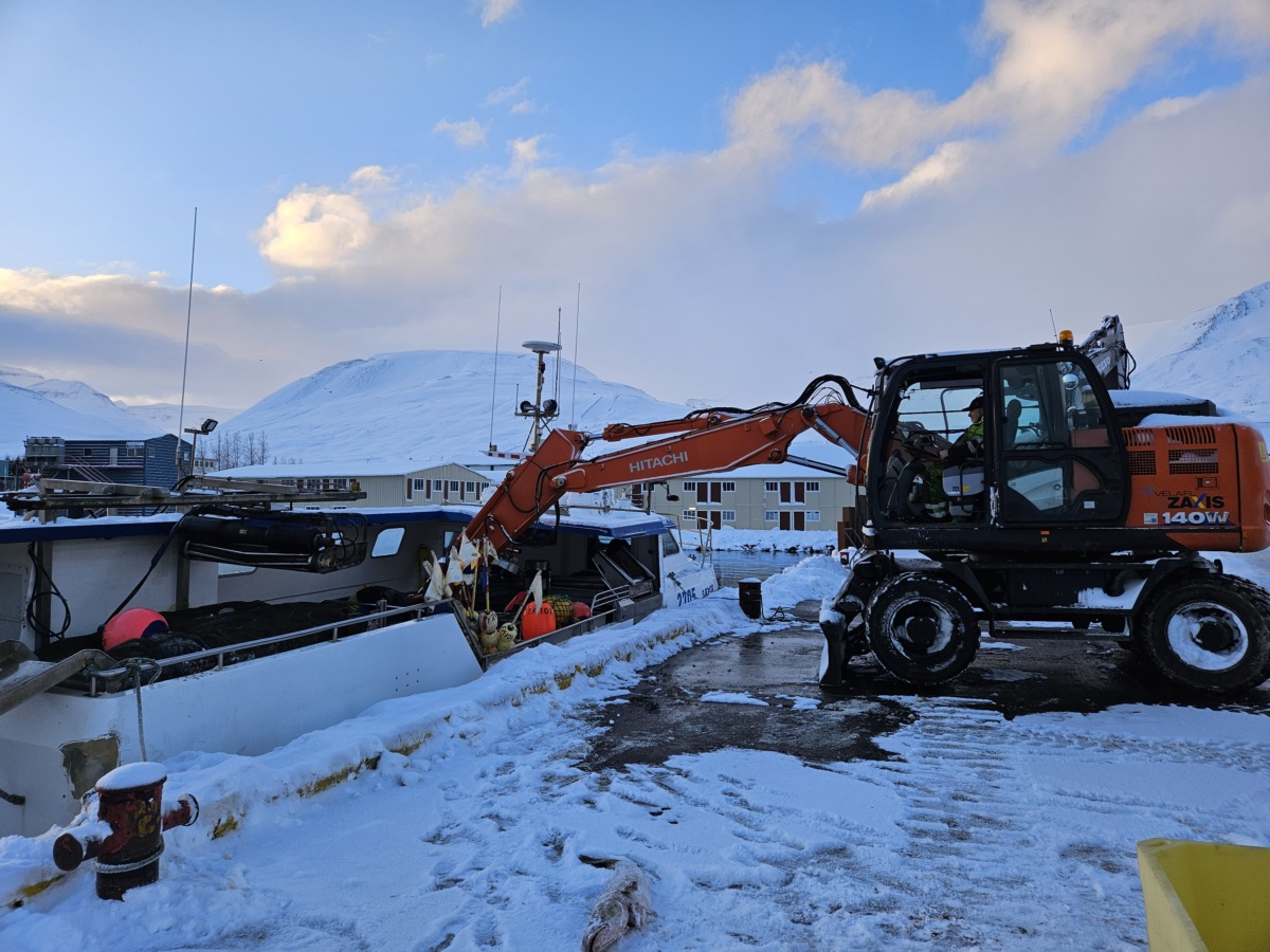 Á meðan unnið er að framkvæmdum er landað upp út bátum með stórri gröfu.