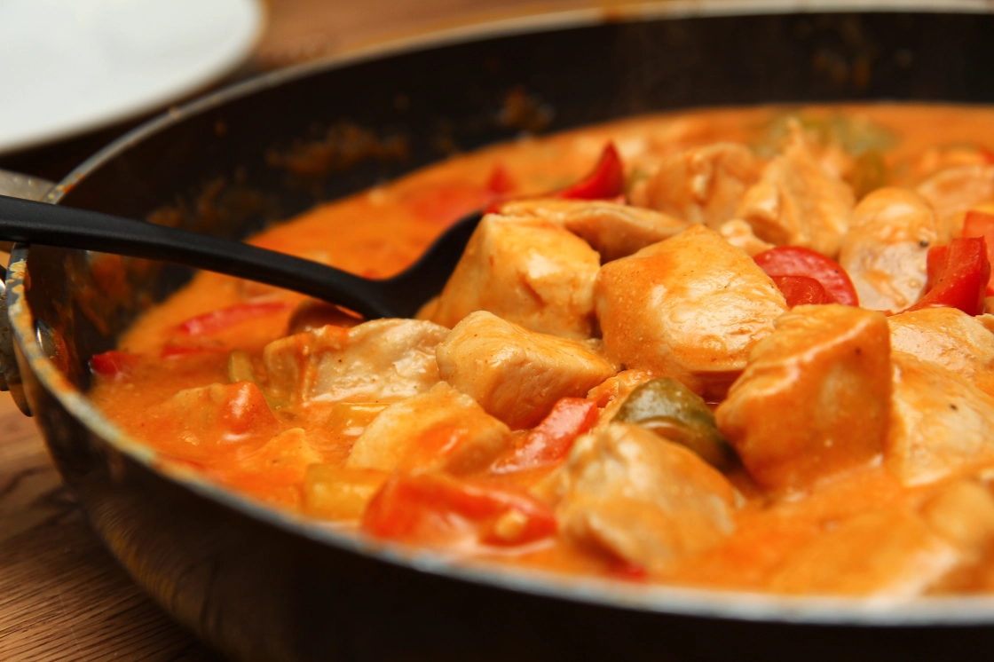 Skerið kjúklingabringur og grænmeti í bita. Steikið kjúklinginn í smjöri eða olíu við háan hita. Saltið og piprið. Bæti paprikum og epli á pönnuna og steikið áfram í nokkrar mínútur. Bætið tómatpuré á pönnuna, stráið hveiti yfir og blandið saman þannig að hveitið verði ekki að kekkjum. Setjið sýrðan rjóma, mango chutney, mjólk og kjúklingateningi á pönnuna og látið sjóða við vægan hita þar til kjúklingurinn er fulleldaður, 5-10 mínútur.