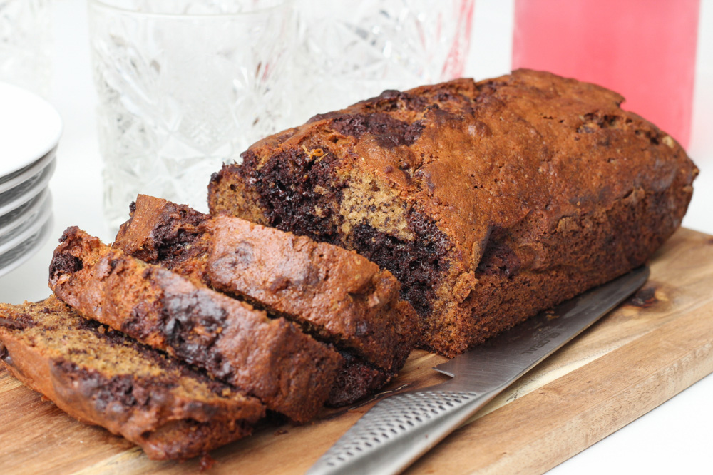 Setjið stórar doppur af deigunum í botninn á forminu (það getur verið gott að miða við að setja einn lit í miðjuna á forminu og hinn sitt hvoru megin við). Setjið næsta lag af deigi þannig að ljóst deig fari yfir dökkt deig og öfugt. Endurtakið þar til allt deigið er komið í formið. Notið smjörhníf eða spaða til að blanda deiginu örlítið saman (það getur verið gott að miða við að gera áttur með hnífnum á tveim til þrem stöðum – passið að gera ekki of mikið!).