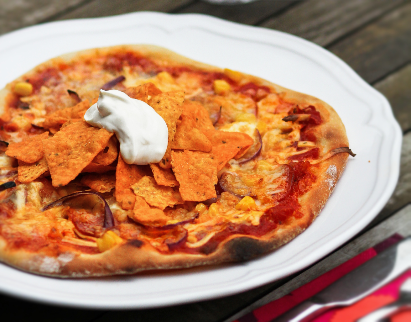 Hitið ofninn í 220°. Þegar deigið hefur fengið að hefast aðeins þá er því skipt niður í eins marga bita og þú ætlar að hafa pizzurnar. Fletjið deigið út, setjið salsasósu yfir botninn og rífið mexíkóostinn yfir. Leggið pepperóni, rauðlauk og maísbaunir yfir. Setjið smá klípur af rjómaosti vítt og dreift yfir pizzuna og endið á að setja rifinn mozzarellaost yfir herlegheitin. Bakið í ofninum þar til osturinn er bráðinn og komin fallegur litur á pizzuna. Takið pizzuna úr ofninum, setjið sýrðan rjóma og gróft mulið nachos yfir pizzuna.