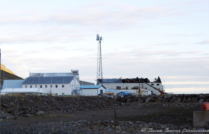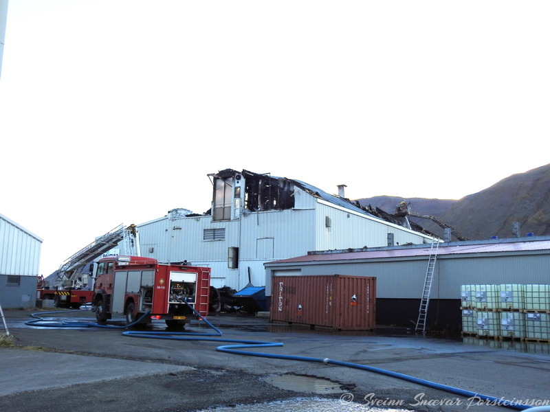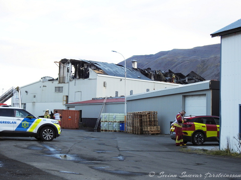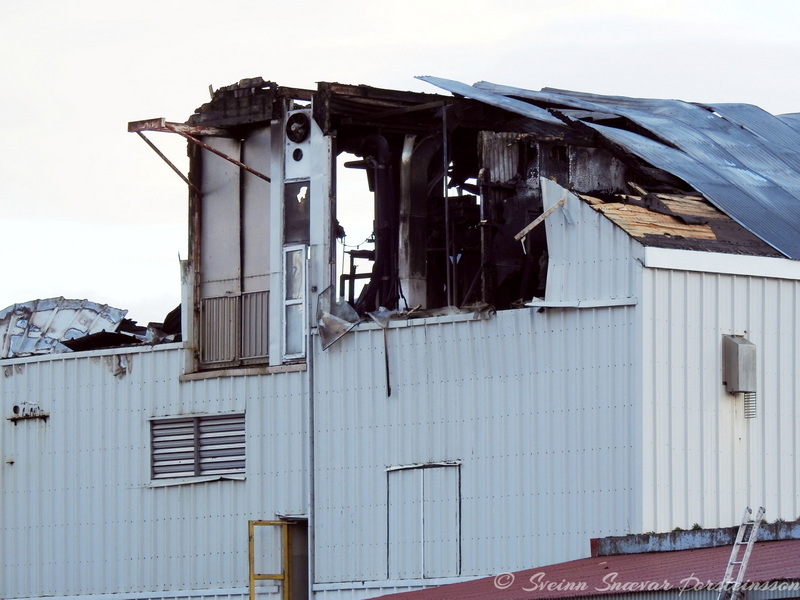 Viðbragðsaðilar unnu í dag að því að rífa þak af verksmiðju Primex á Siglufirði eftir mikinn eld sem kviknaði í húsinu í gærkvöldi. Hreinsun á þakplötum og þaki norðan megin hússins er þegar lokið.