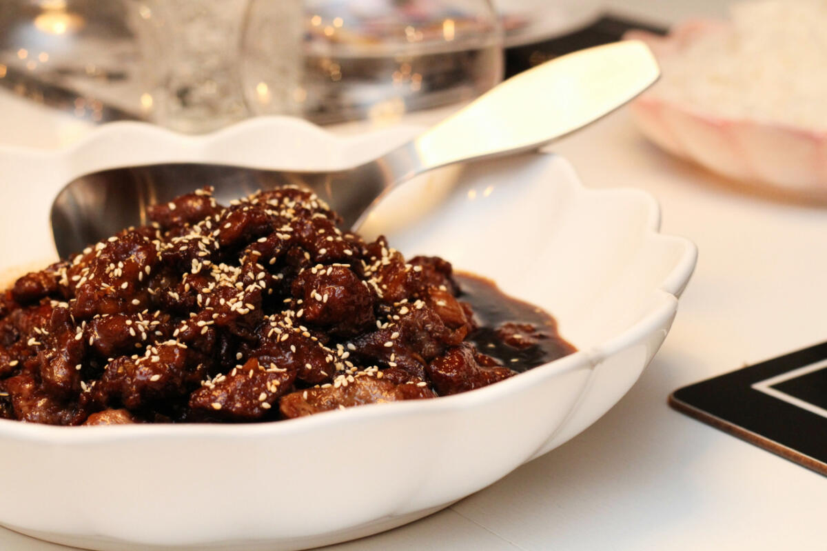 Hitið olíu á djúpri pönnu (um 1 bolli eða 2,5 dl er passlegt) og djúpsteikið nautakjötið. Passið að setja það í skömmtum á pönnuna, svo það sé ekki of mikið kjöt á henni í einu. Brúnið kjötið á báðum hliðum, í um 1-2 mínútur á hvorri hlið. Takið kjötið úr olíunni og látið renna af því á eldhúspappír.