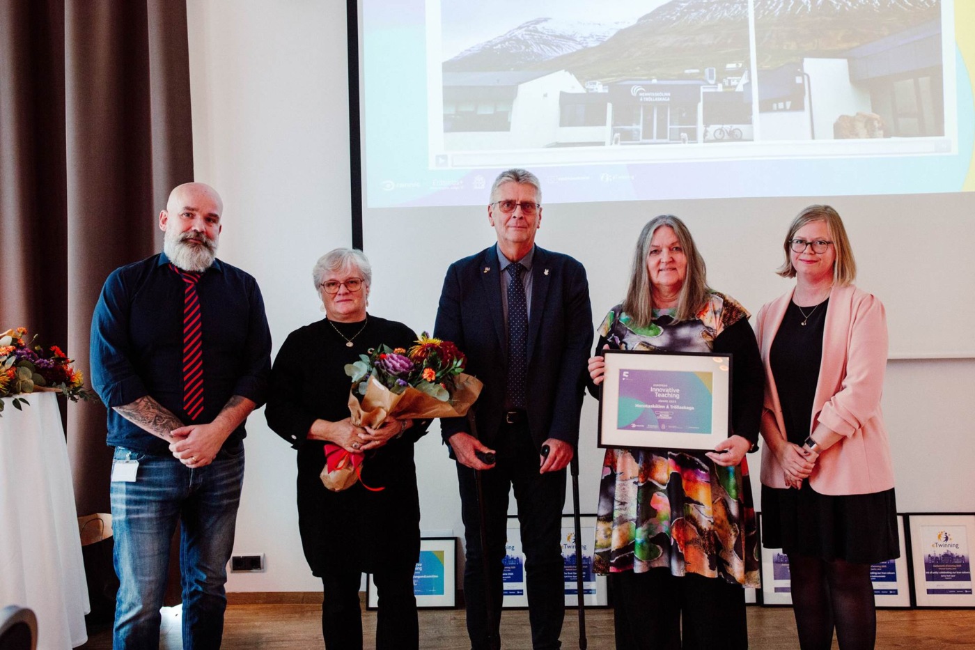 Ágúst Hjörtur Ingþórsson forstöðumaður Rannís og Eydís Inga Valsdóttir, verkefnastjóri eTwinning á Íslandi, afhentu eTwinning viðurkenningarnar og verðlaunin. Rannís og Landskrifstofa Erasmus+ standa að Evrópsku nýsköpunarverðlaununum í kennslu og eTwinning gæðaviðurkenningum.
